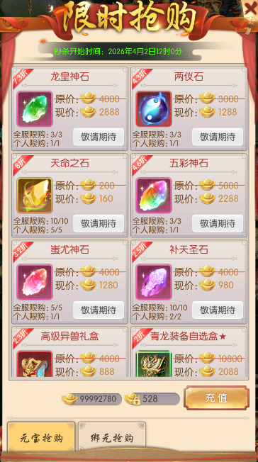 活动期间,可用元宝或绑元限时抢购各种珍贵道具,数量有限,各位少侠千万不要错过!