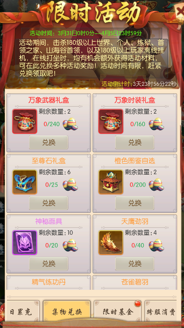 击杀180级以上世界首领、个人首领、炼狱首领、首领之家首领,或180级以上玩家进行离线挂机、在线挂机等均有机会额外获得【复活节彩蛋】,可在限时兑换中兑换丰厚奖励。