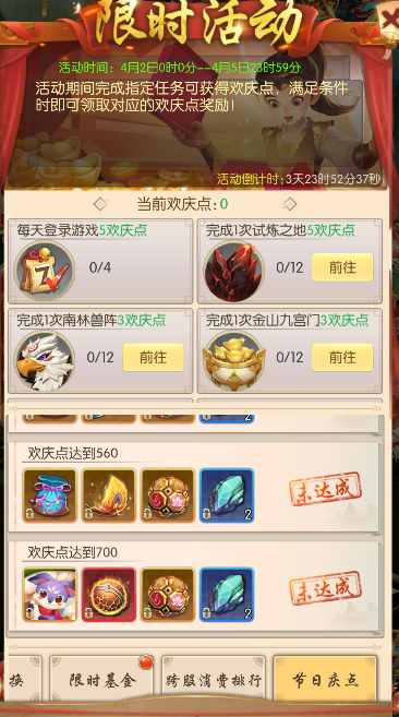 活动期间完成指定任务可获得欢庆点,满足指定条件时即可领取对应的欢庆点奖励!