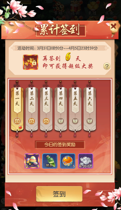 l 活动期间,每日登录之后可以进行签到,每次签到即可领取一份奖励;