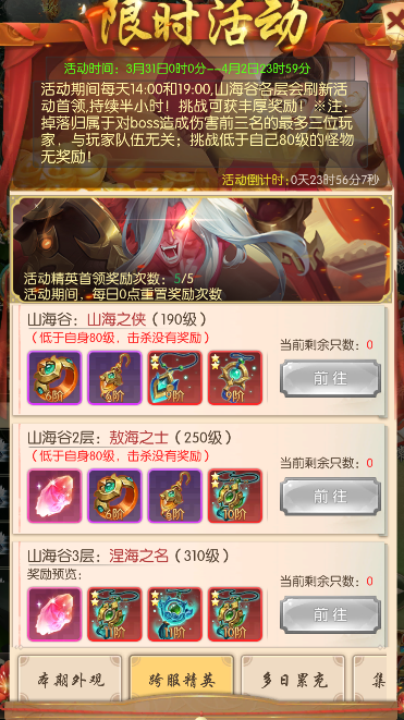 每天14:00和19:00,山海谷各层均会刷新活动精英,挑战可以获得丰厚奖励!