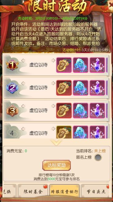 l 消费达5000元宝可参与排名,排行榜每10分钟刷新1次;